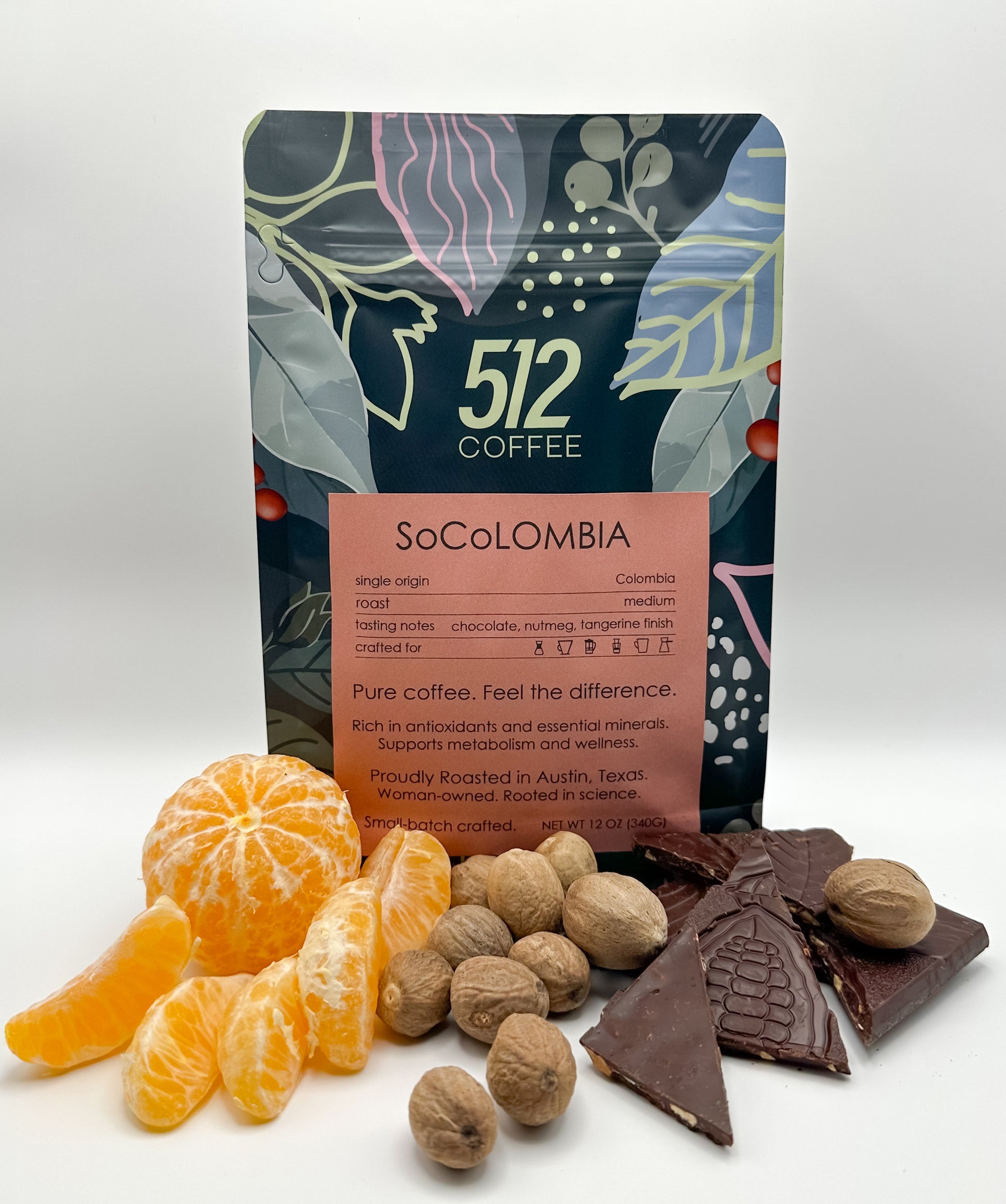 This vibrant cup features a complex profile with notes of chocolate, citrus brightness, and a touch of aromatic nutmeg—offering a truly elevated take on the classic Colombian medium roast.